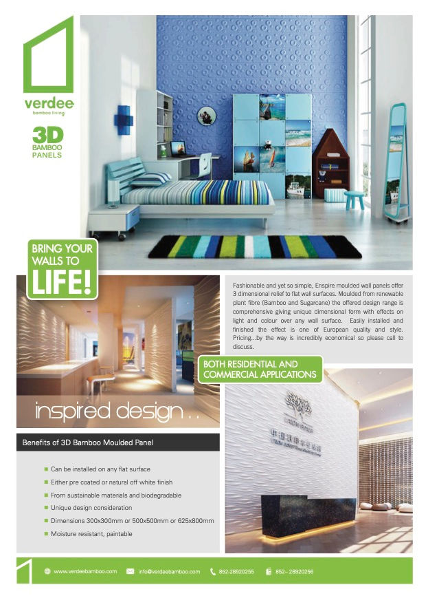 Created with design consideration given to dimensional form and its effect on light and colour, the bamboo-pulp-made VERDEE 3D Wall Panels can set mood and atmosphere, from the subtle to the dramatic. These panels can be installed upon most surfaces using suitable adhesives. Once mounted, the panels can either remain their natural off white finish, or alternatively be prepared to create an endless monolithic affect by application of an undercoat /sealer, gap filler between panels and then the paint of your choosing applied by spray, brush or roller.